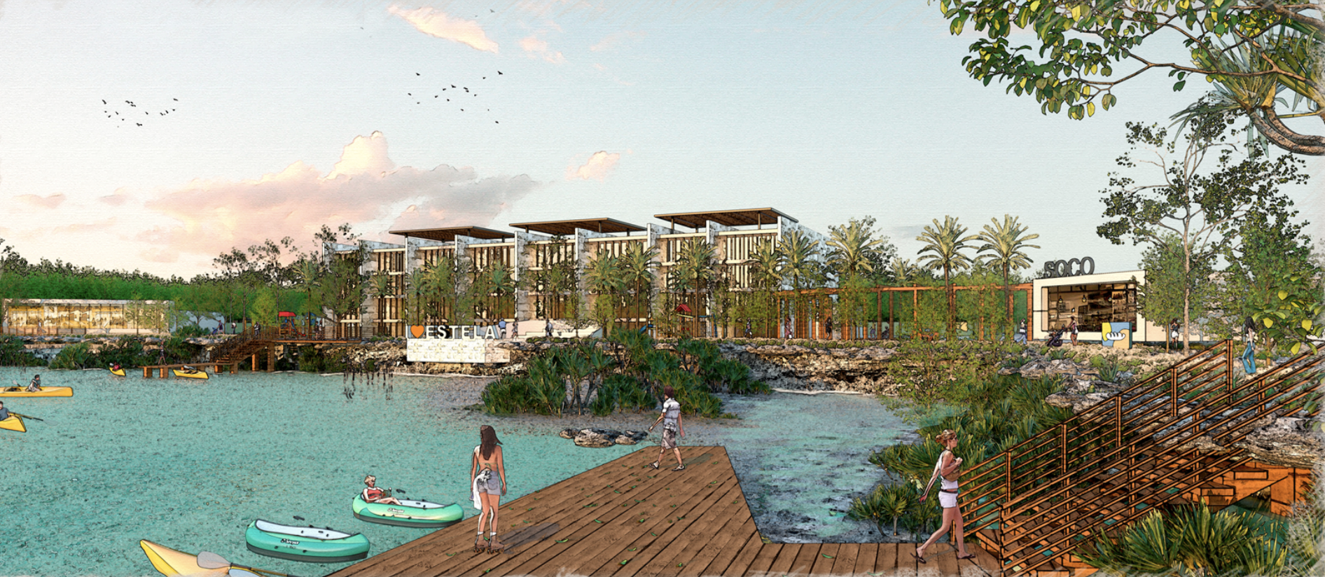 Las amenidades en general convivirán con el entorno de tal forma que la gente socialice en espacios abiertos y naturales. A propósito de esto, se quieren aprovechar los cuerpos de agua que circulan por Estela Norte para actividades como remar.