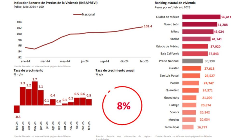 De acuerdo con el Indicador Banorte Precios de la Vivienda, durante febrero de 2025 se registró una variación nacional anual del 8%, que “refleja una tendencia general al alza en el mercado inmobiliario mexicano, impulsada por la paulatina recuperación que ha representado la economía mexicana”.