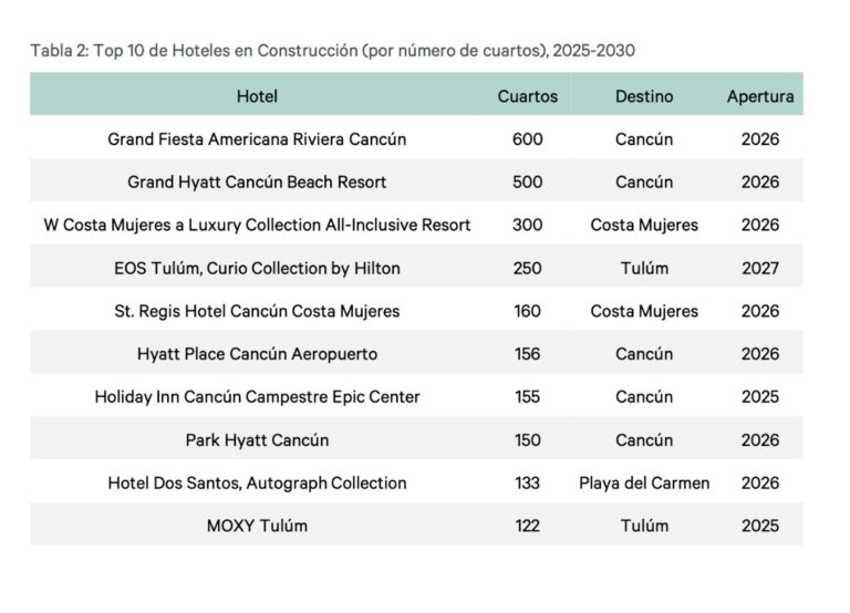 Grand Fiesta Americana Riviera Cancún, W Costa Mujeres a Luxury Collection All-Inclusive Resort, Hyatt Place Cancún Aeropuerto, Hotel Dos Santos Autograph Colletion, son alguno de los complejos turísticos en abrir puertas entre 2026 y 2027, que sumaran en conjunto más de 2,500 cuartos.