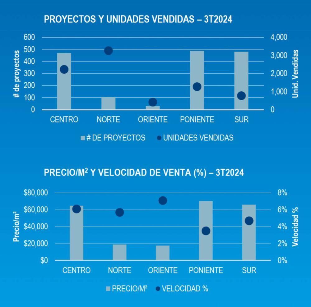 Por su parte, la zona centro tuvo un incremento del 8% anual en comercialización, concentrando el 28% de participación. En el 3T24 se registra un total de 12,247 unidades disponibles y 398 proyectos activos.