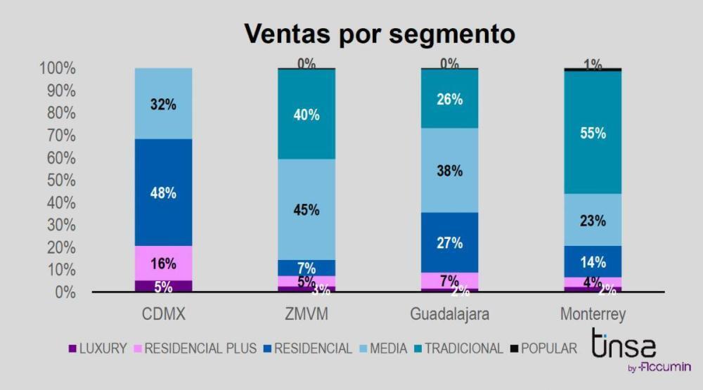 Del total de las unidades comercializadas en la capital del país, 48% corresponden a Residencial, 32% al segmento Medio, 16% a Residencial Plus y 5% Luxury.