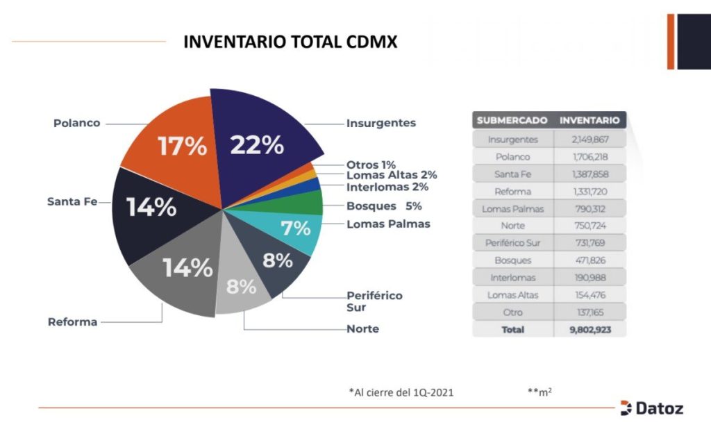 En cuanto al inventario de oficinas, el 1T2021 cerró con alrededor de 9.8 millones de m2 en CDMX, los corredores Insurgentes, Polanco, Santa Fe y Reforma en conjunto acumularon el 67% del inventario.