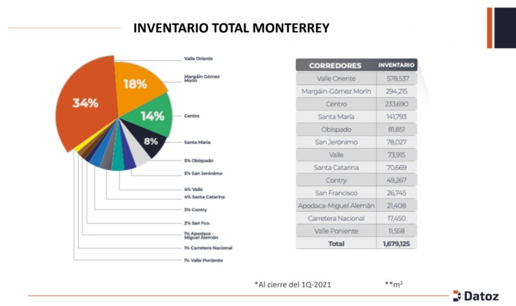 Monterrey tiene un registro de más de 1.6 millones de m2 de inventario, “existe un corredor que concentra más de una tercera parte del mercado total que es Valle Oriente; casi el 75% del inventario se encuentra Valle Oriente, Margáin – Gómez Morín, Centro y Santa María”.
