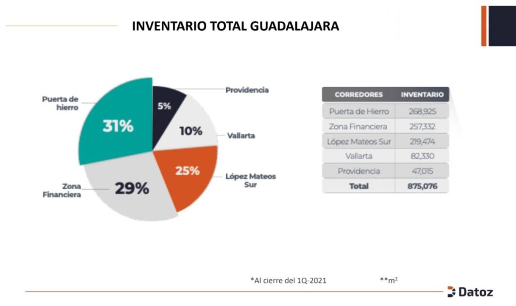 En Guadalajara el inventario al 1T2021 era de 875,076 m2, de los cuales los corredores de Puerta de Hierro, Zona Financiera y López Mateos Sur son los que concentran más m2.