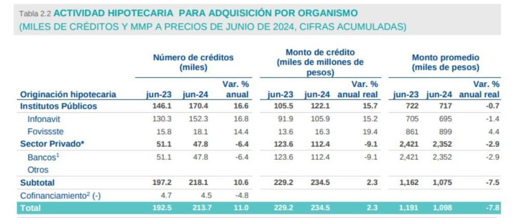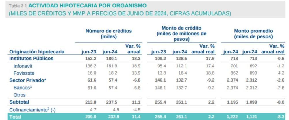 BBVA resaltó que el crédito hipotecario otorgado por la banca comercial se ha mantenido por el segmento de vivienda residencial, el cual muestra una reducción del 9.5%, el segmento medio tiene una caída de 16.3% y el segmento de interés social ha disminuido 50.1% en comparación anual contra junio de 2023.