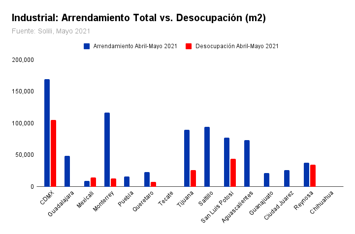 De acuerdo con cifras de Solili, la demanda bruta industrial a nivel nacional fue de 354 mil metros cuadrados durante el mes de mayo, acumulando 804 mil metros cuadrados para el periodo abril-mayo. En el primer trimestre (1T) de 2021, la demanda total fue de 1.2 millones de metros cuadrados, por lo que se espera que para el segundo trimestre las cifras sean superiores y reporten incrementos entre 10 y 15%.