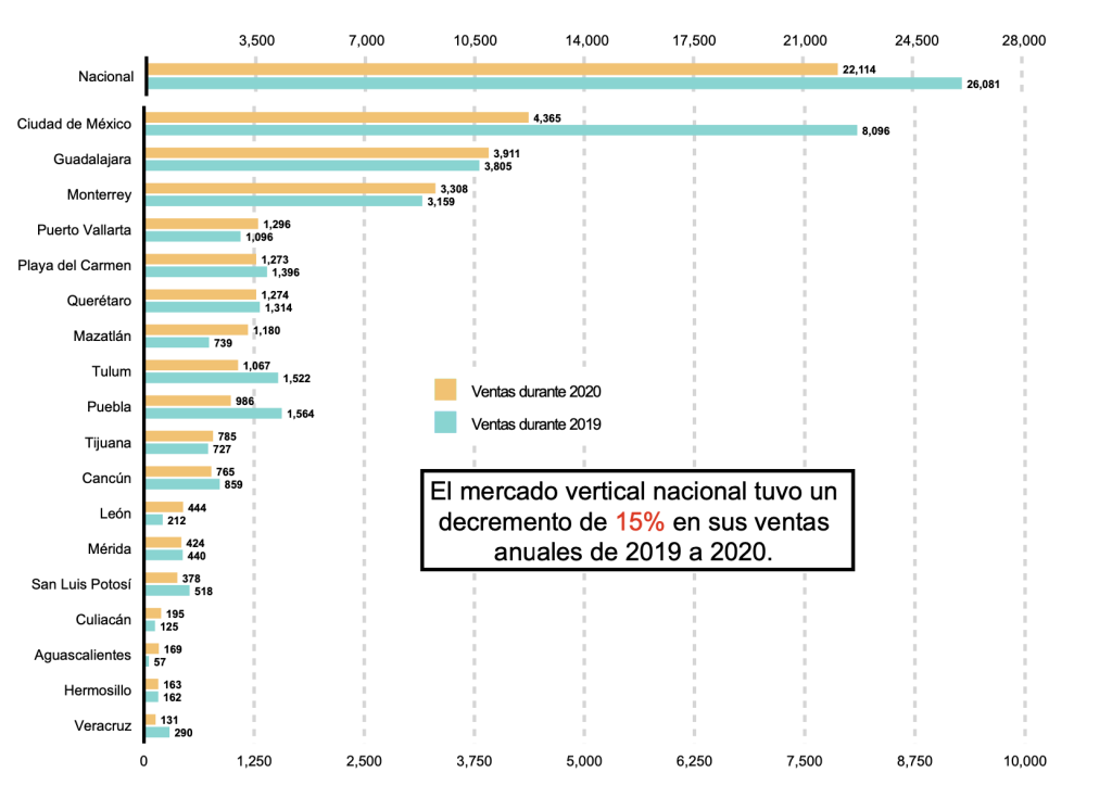 Aquí podemos ver que el mercado vertical a nivel nacional bajo sus ventas en 15% de 2019 a 2020. Sin embargo, ciudades como Monterrey y Guadalajara presentaron crecimientos en sus ventas de 5% y 3% respectivamente, mientras que Cd. de México tuvo una contracción de 46%. Ciudades como Puebla y Tulum tuvieron un decremento de 37% y 30% respectivamente, mientras León aumentó sus ventas más de un 109% de 2019 a 2020.