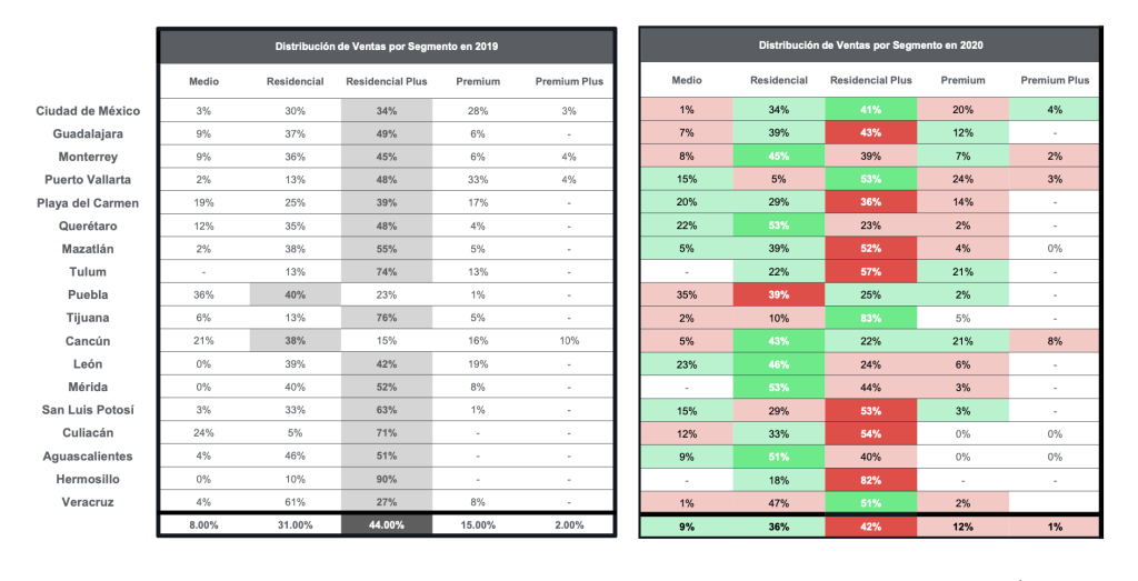 Si comparamos las ventas por segmento de 2020 respecto a 2019, podemos ver que en general hubo un incremento en la proporción de ventas que se concretaron en los segmentos Medio y principalmente Residencial, frecuentemente a costa de los segmentos superiores, en particular Residencial Plus. Se puede ver un comportamiento similar para Premium Plus en aquellas ciudades que cuentan con oferta en ese segmento, donde su disminución en ventas se vió reflejada como una ganancia en Premium o incluso en Residencial Plus.