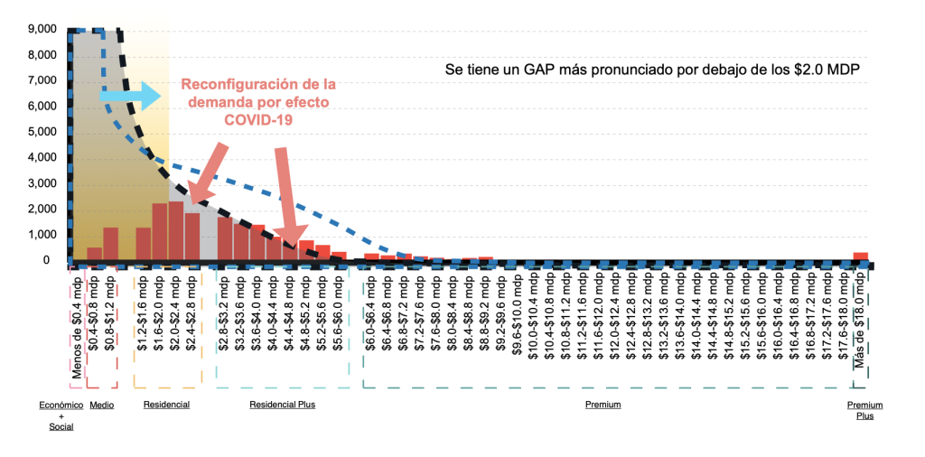 Este año 2020 fue sumamente inusual debido a la pandemia COVID-19. Estuvimos más de 8 meses en aislamiento, hubo un decremento económico, y la demanda de vivienda respondió a estos factores. En esta gráfica podemos ver cómo la demanda de vivienda vertical se contrajo por encima de $1.6 mdp, lo cual redujo el GAP de vivienda y provocó que prácticamente desapareciera por encima de $4.0 mdp. Sin embargo, la necesidad de vivienda no desaparece, sino que se reconfigura, como se puede apreciar en la expansión de demanda por debajo de $1.6 mdp. Si comparamos con las ventas de producto vertical durante 2020, resulta evidente que esta reconfiguración de la demanda acentuó el déficit de vivienda para los segmentos Económico, Medio y la franja inferior de Residencial.