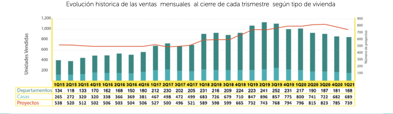 La dinámica de desarrollo habitacional en la base de datos DIME de Softec cuenta con aproximadamente 739 proyectos que aportan 38,216 viviendas al mercado para el cierre del primer trimestre de 2021. Se estima que al mes las ventas son de aproximadamente 860 unidades, tamaño de mercado que se dio a la baja conforme al año anterior en el mismo periodo (1Q20) con un total de 1,020 ventas.