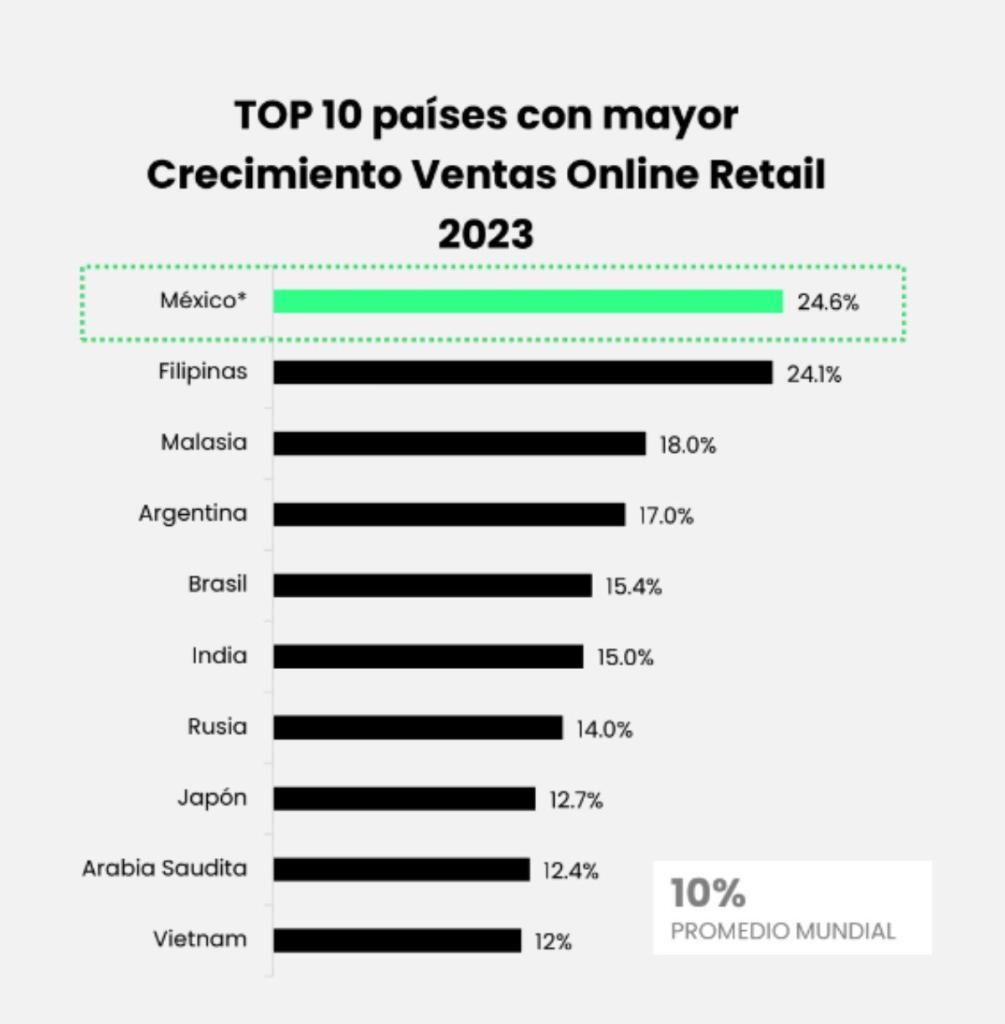 Durante el 2023, México se posicionó como el país número uno en crecimiento de e-commerce retail a nivel mundial, después de ser parte de los países con mayor velocidad de aceleración por seis años consecutiva, según el Estudio de Venta Online 2024.