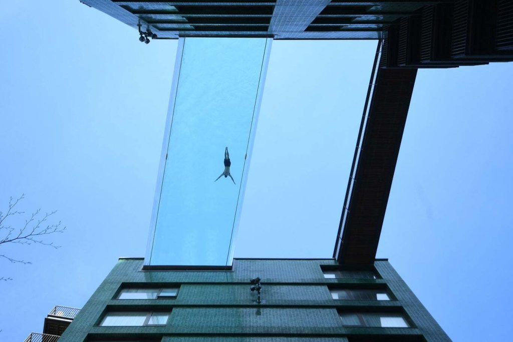 La piscina está hecha de una sola pieza de policarbonato transparente de 35 centímetros de grosor y, con sus 25 metros de largo y 61 toneladas de peso, une dos edificios residenciales de lujo. Estas dimensiones le dan la capacidad de albergar hasta 148 mil litros de agua.