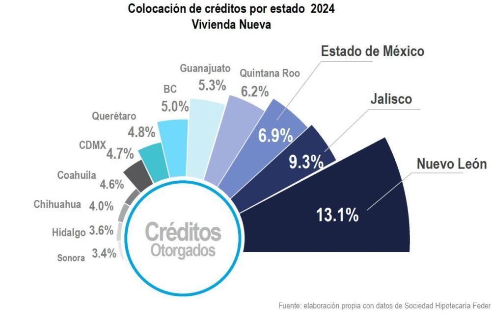 Durante el 2024, Nuevo León fue el estado de México que lideró la colocación de créditos hipotecarios con el 13.1%, seguido de Jalisco (9.3%) y Estado de México (6.9%), según el análisis “Perspectivas del Mercado Inmobiliario 2025” elaborado por Tinsa México by Accumin. “La participación de estos tres estados en la colocación de créditos similar a la de 2023”.