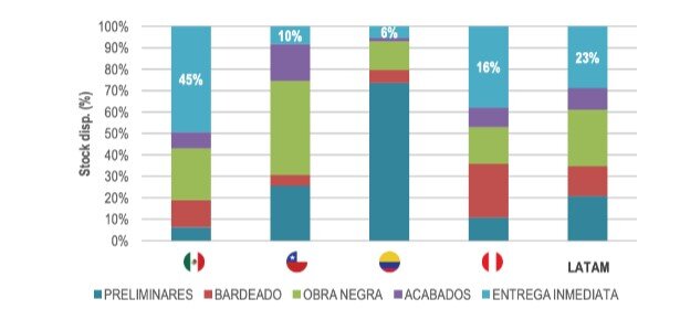 Con relación al avance de edificación en la Ciudad de México es la capital con más proyectos en fase de entrega inmediata (45%), seguida de Lima (16%). Por su parte en Bogotá más del 70% de los proyectos se encuentran en preliminares, en tanto que en Santiago el mayor porcentaje se encuentra en obra negra.