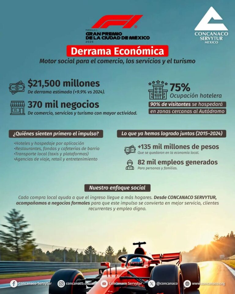 El Gran Premio de México 2025 en la CDMX dejará una derrama estimada de 20 mil millones de pesos, lo que representa un incremento del 16.47% frente al 2024, según CANACO SERVYTUR.