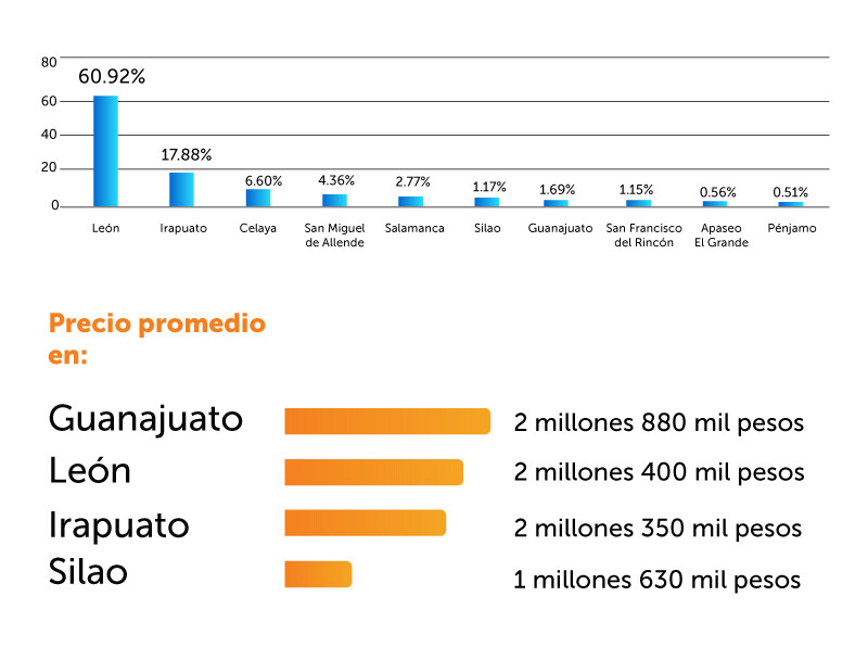 De acuerdo con nuestro Reporte 2020, por municipio se puede apreciar que la demanda inmobiliaria está concentrada en su mayoría en León con un 60.92% y en Irapuato con un 17.88%, en tercer lugar se encuentra Celaya con una participación de 6.60 por ciento.