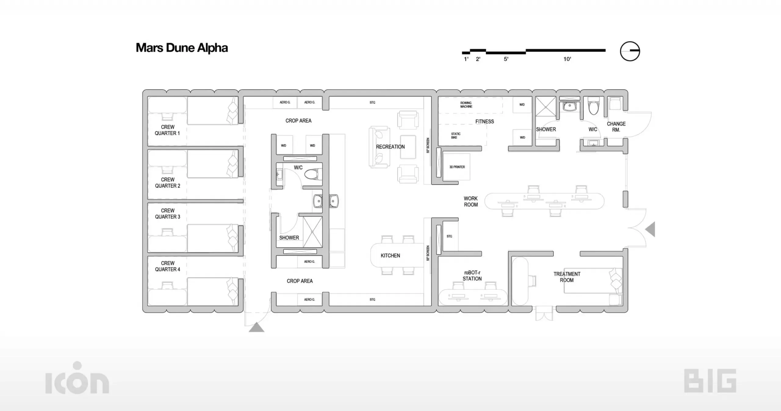 El diseño de la estructura innovadora está organizado en cuatro habitaciones privadas para albergar a la tripulación que se ubicarán en un extremo del hábitat.