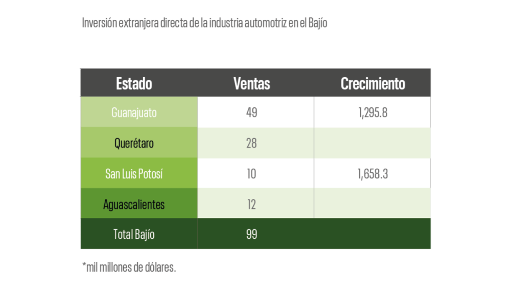 Los mercados del Norte y Bajío acapararon el IED para el sector automotriz. En el caso del Bajío, la región sumó un IED de $4,369.5 millones de dólares. San Luis Potosí fue el estado que recibió mayor inversión para esta industria, con $1,658.3 millones de dólares, seguido por Guanajuato, con $1,295.8 millones de dólares, Querétaro con $878.6 millones de dólares y Aguascalientes con $536.8 millones de dólares. Estás inversiones han beneficiado directamente al mercado inmobiliario industrial con la demanda de naves y tierra industrial para establecer sus operaciones manufactureras y logísticas.