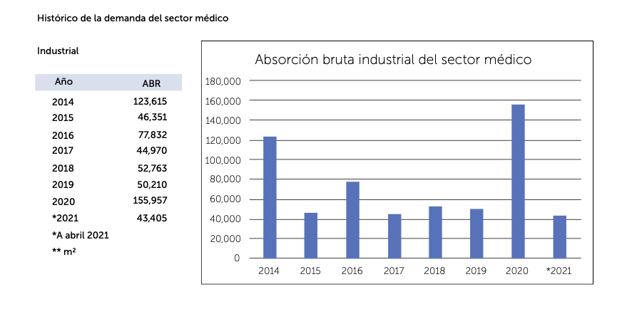 Durante 2020, las industrias médica y farmacéutica registraron una absorción bruta de 155,957 m2 de área neta rentable (ANR), 211% superior al año previo. Además, esta cifra es la más alta para un año desde 2014, cuando fue de 123,615 m2; ya que, durante los últimos cinco años, el promedio en la demanda de espacios para estos sectores fue de 55,000 m2.