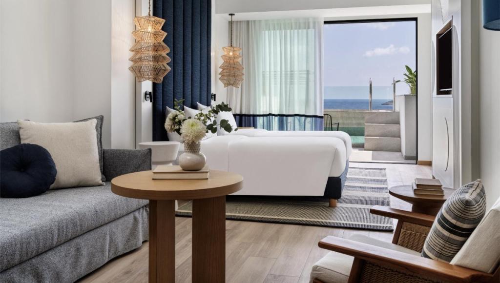 “Para una experiencia cretense hogareña lejos de casa, los huéspedes pueden elegir de una amplia gama de opciones de suites que incluyen camas king, balcones amueblados con impresionantes vistas al mar, duchas y sofácamas”.