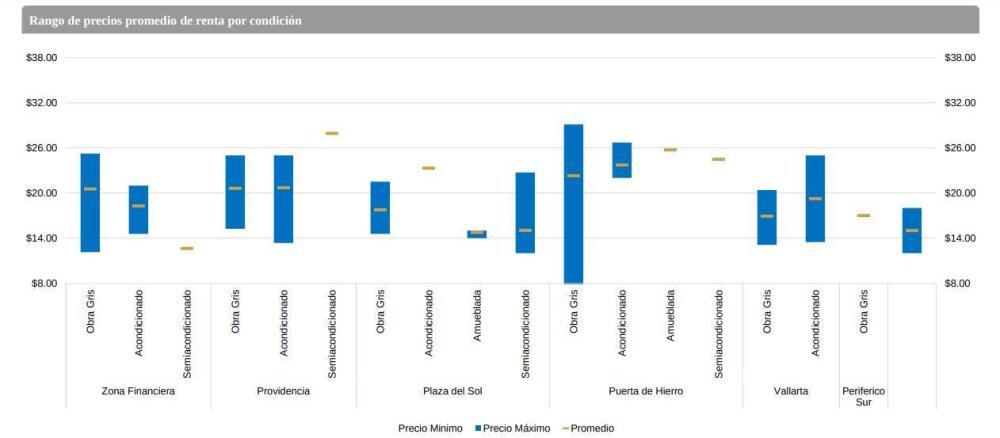 “El rango de precios que se tienen dentro de las condiciones de entrega en algunos casos va de los 7.7 a los 29.13 dólares por m2. Los espacios entregados en obra gris ofrecen precios que van de los 7.77 a los 29.13 dólares por m2, para los espacios entregados acondicionados los precios van de los 12.00 a los 26.70 dólares por m2, estos valores dependen de la ubicación, acabados, infraestructura, servicios incluidos y la distribución de los espacios”.