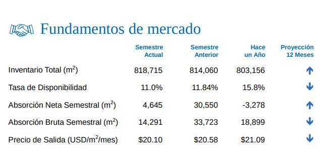 La absorción bruta semestral en el 2S24 fue de 14,291 m2; mientras que la tasa de disponibilidad es de 11.0%; y la tasa de absorción neta en 4,645 m2.