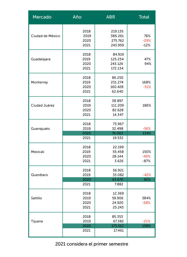 Al cierre del primer semestre de 2021, el mercado inmobiliario industrial a nivel nacional registró una absorción bruta total de 2.5 millones m2 de área bruta rentable (ABR), de los cuales 645,245 m2 (25.7%) fueron destinados a actividad logística. Con estos números se estima que la absorción continúe en lo que resta del año con su buen ritmo y supere los 5 millones m2, lo que superaría niveles prepandemia, por lo que la demanda de espacios logísticos también podría romper récords.