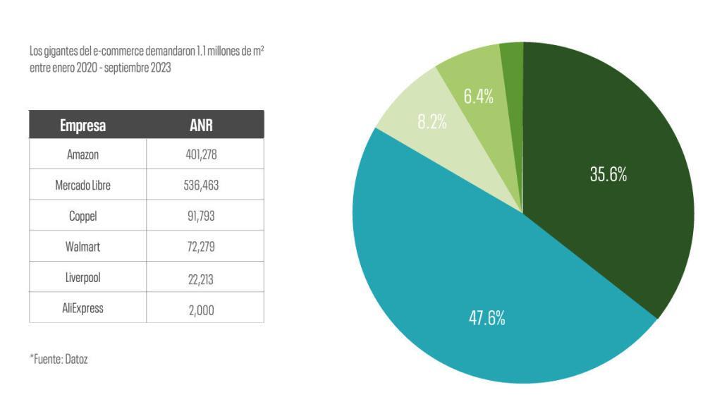 En los últimos cuatro años estas compañías han reforzado sus inversiones para tener mayor presencia en el territorio mexicano y cumplir con la demanda del mercado, por lo que entre 2020 y septiembre de 2023, Amazon, Mercado Libre, Walmart, Coppel, Liverpool y AliExpress han arrendado más de 1.1 millones de metros cuadrados de superficie industrial, de los cuales el 90% se concentra en las principales ciudades del país: Ciudad de México, Monterrey, Guadalajara, Guanajuato, Tijuana y Mérida, de acuerdo con información de Analytics 2.0 de Datoz.