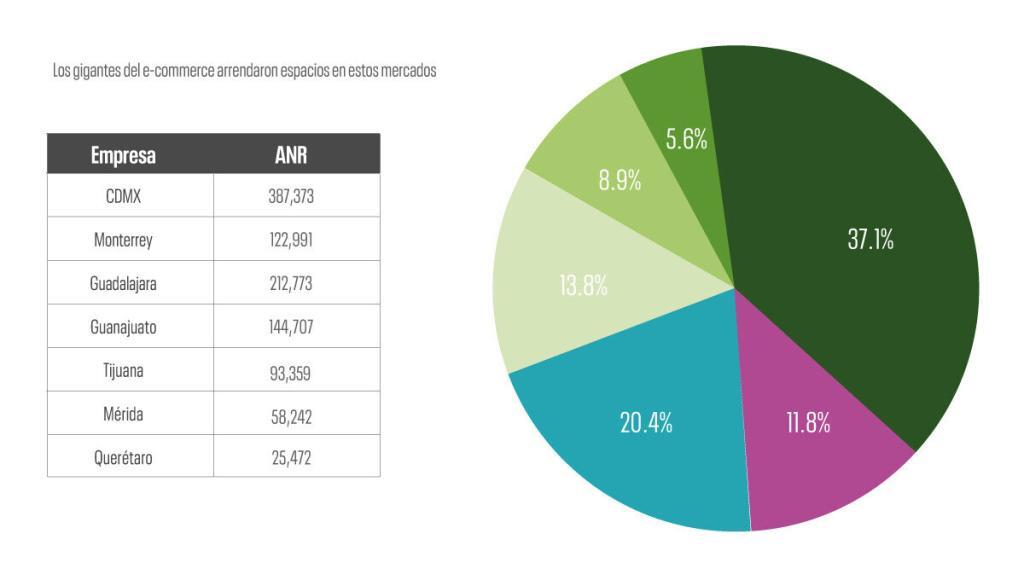 El 64% de la demanda de espacio industrial de estas empresas se concentra en Ciudad de México, Monterrey y Guadalajara, es decir, más de 720,000 metros cuadrados. Si bien, no todas las compañías arrendaron espacios en los tres mercados, si lo hicieron Amazon y Mercado Libre, que juntas suman más de 600,000 metros cuadrados, de acuerdo con información de Analytics 2.0 de Datoz.