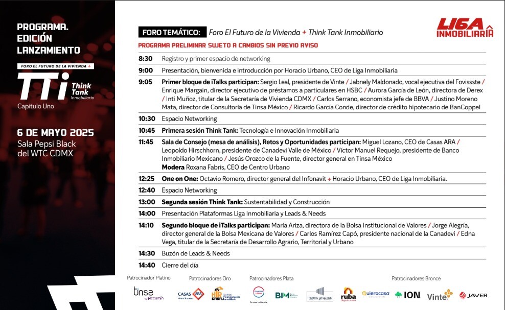 Con un enfoque en innovación, negocio y desarrollo, el foro Liga Inmobiliaria busca posicionarse como la plataforma para incubar y acelerar proyectos clave en el sector, integrando la primera edición del Think Tank Inmobiliario en México (TTi), un espacio único donde se presentarán ideas y proyectos que buscan inversión y mentoría de los mejores players de la industria.
