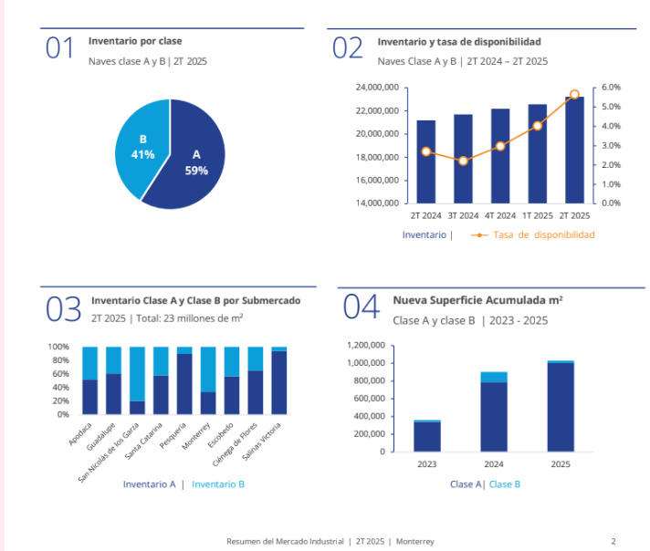 Según cifras presentadas por Colliers, al cierre del 2T2025, se monitorearon mil 867 naves clase A y B en Monterrey. Esto sumó un total de 23.2 millones de metros cuadrados (m2) distribuidos en los nueve submercados que conforman este mercado industrial.