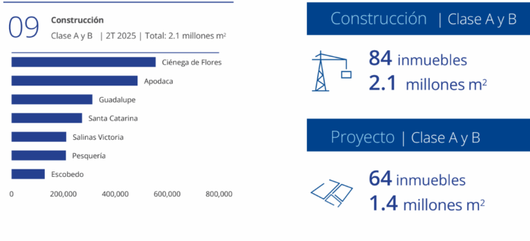 A junio de 2025, se monitoreron 84 propiedades industriales clase A y B construyéndose en Monterrey, lo que representan 2.173 millones de m2. Se espera que estas obras concluyan durante el 2025 e inicios del 2026.