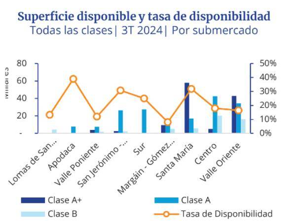 Asimismo, en el reporte se señaló que la superficie disponible en el mercado de oficinas en Monterrey se concentra en tres principales subermercados: Santa María con mayor clase A+, Centro con A y Valle Oriente de A+ y A.