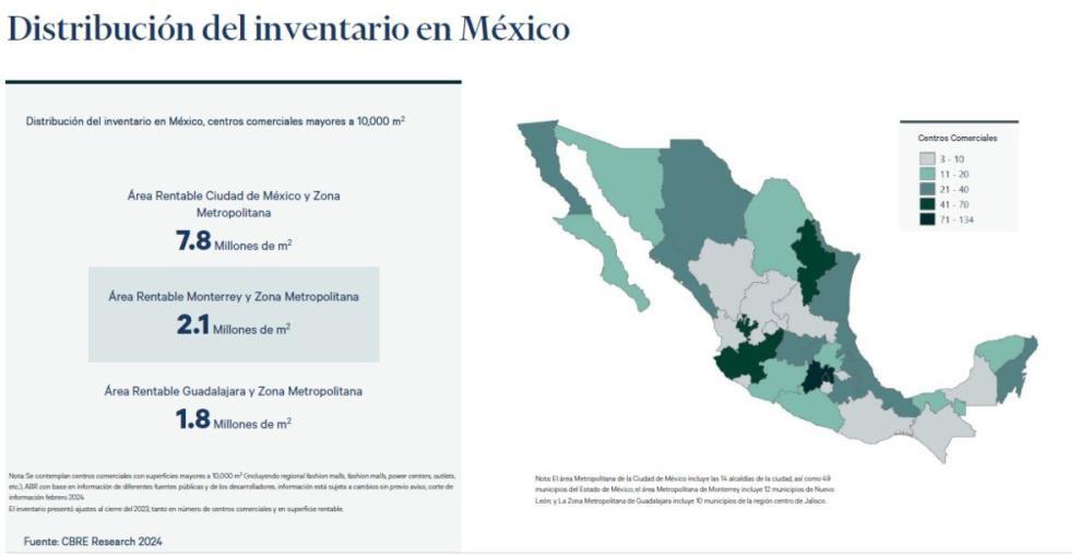 Al cierre del 2023, la región contempla 1.7 millones de m² de centros comerciales con áreas superiores a 10,000 m² del tipo Power Center. En 2024, CBRE informó que se estima la apertura de un Powe Center de 34,000 m².
