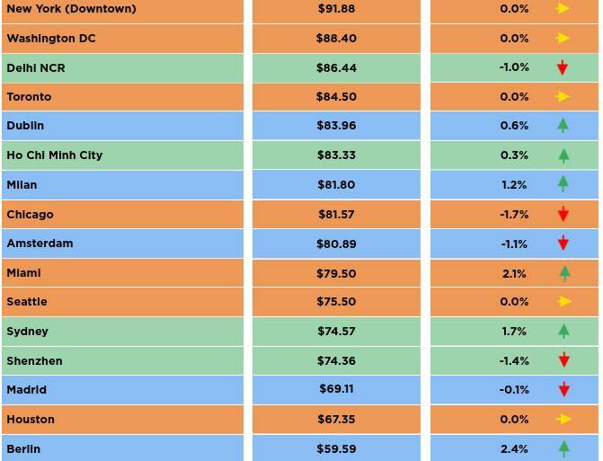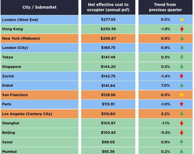 De los 35 mercados monitoreados de oficinas por Savills, 15 incrementaron sus costos netos efectivos; lo anterior fue el resultado del crecimiento del alquiler bruto y del aumento de los costos de equipamiento. Sin embargo, también muchos vieron una disminución, así como aumentos en las concesiones de los propietarios, lo que ha frenado los costos generales.