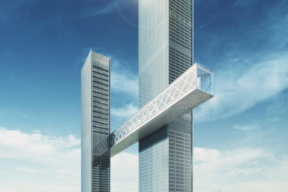 El edificio, ubicado en el distrito financiero central de Dubái, Emiratos Árabes Unidos (EAU), está compuesto por dos torres de 305 y 235 metros, conectadas por un puente horizontal que flota a 100 metros sobre el suelo, nombrado “The Link”.