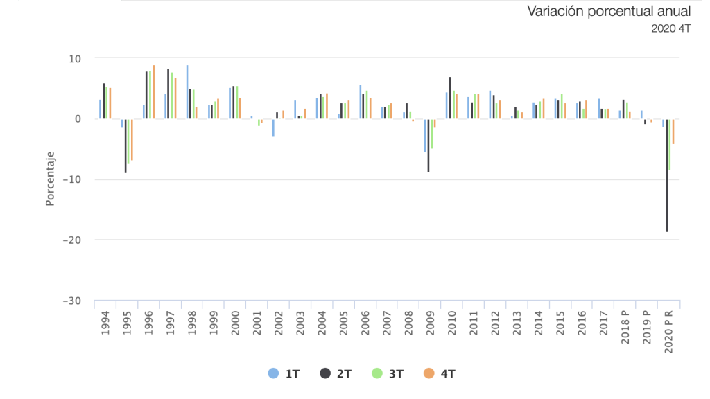 Aunque hubo un crecimiento chico, el PIB está 2.9% más contraído que en la misma estacionalidad del 2020. Además, este alcanzó un mínimo histórico que no se había visto desde 1932 en el 2T2020, llegando a casi una caída del menos 20% en esos meses y una contracción del 8.5% en todo el año. Es importante mencionar que este retroceso económico comenzó a principios de 2019