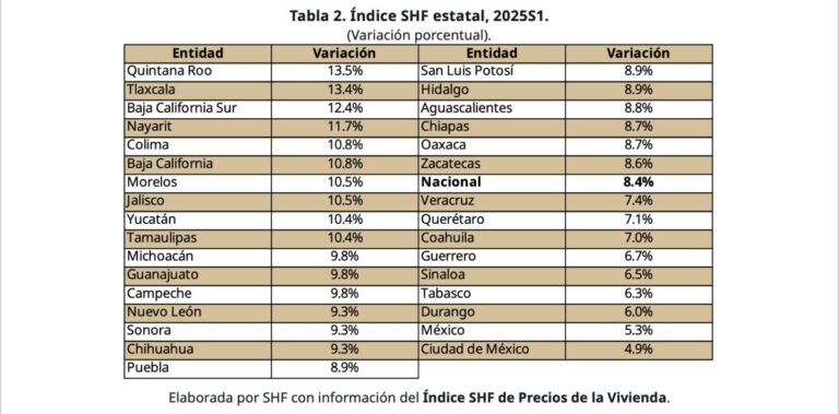 De acuerdo con el Índice de precios de la Sociedad Hipotecaria Federal (SHF), en el segundo trimestre de 2025 (2T25) la vivienda mostró un crecimiento de 8.7% a nivel nacional en comparación con el mismo periodo de 2024. El acumulado anual fue de 8.4 por ciento.