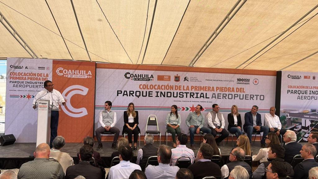 Autoridades de Coahuila y empresarios de Grupo Capital colocaron la primera piedra del Parque Industrial Aeropuerto, en Ciudad Frontera.