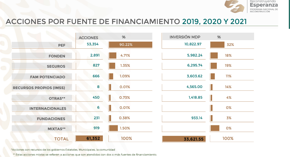 Así como del Fondo de Aportaciones Múltiples (FAM) y el resto, de seguros, del Fondo para la Atención de Emergencias (Fonden), fundaciones, entre otras fuentes de financiamiento.