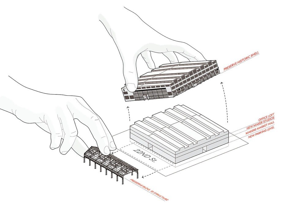 Su diseño incluye tres colosales portales rojos y paredes de ventanas totalmente operables a lo largo de las fachadas para maximizar la conexión entre el interior del mercado, las plazas peatonales y las calles circundantes. Mientras que la planta baja y el mezzanine están totalmente abiertos al público, el nuevo segundo nivel albergará estudios de artesanos y fabricantes, y el antiguo Mold Loft de la planta superior se destinará a lugares de trabajo.
