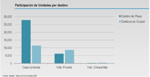 La oferta de alojamiento mediante plataformas digitales, tipo Airbnb, en 6 de las principales ciudades turísticas del país –los destinos urbanos de CDMX, Querétaro y Tijuana, y los de playa Playa del Carmen, Cancún y Los Cabos- alcanzó al 1T2021 54,768 unidades activas, el 63% de estas se concentra en destinos de playa.