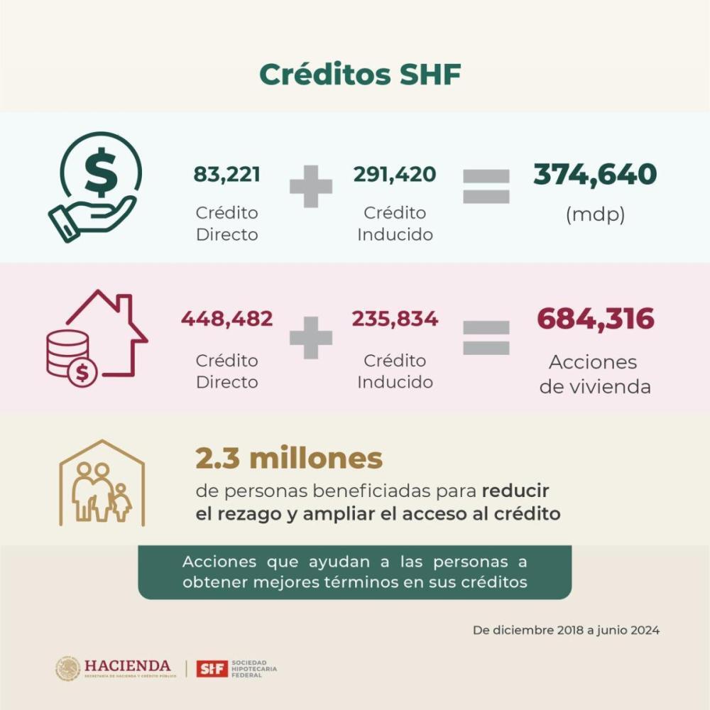 Asimismo, en su cuenta de X, antes llamada Twitter, el titular de la SHF indicó que se llevaron a cabo 684 mil 316 acciones de viviendas, de las cuales 448 mil 482 fueron crédito directo y 235 mil 834 inducido.