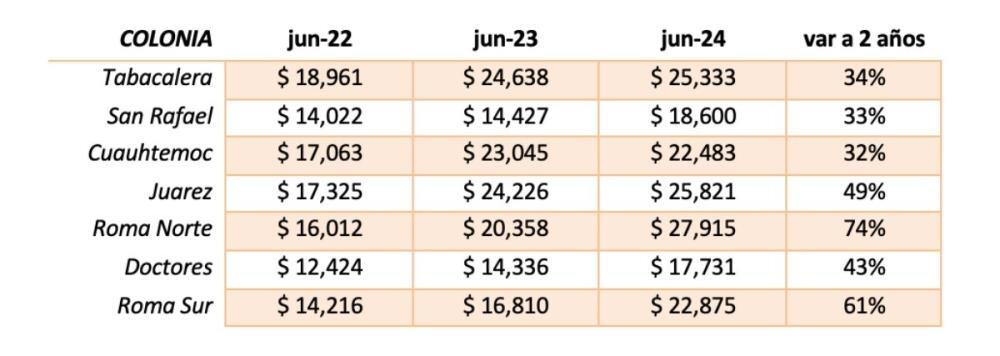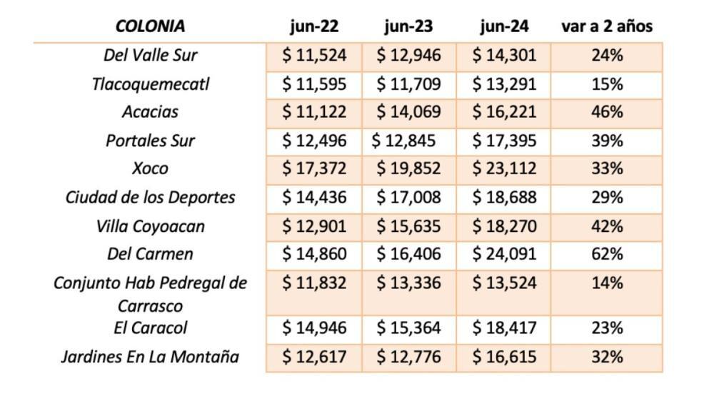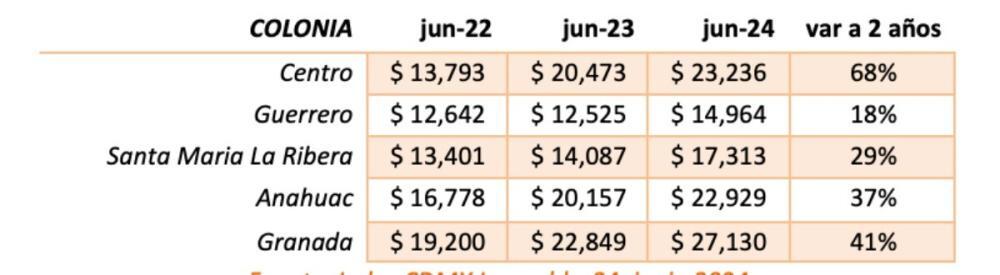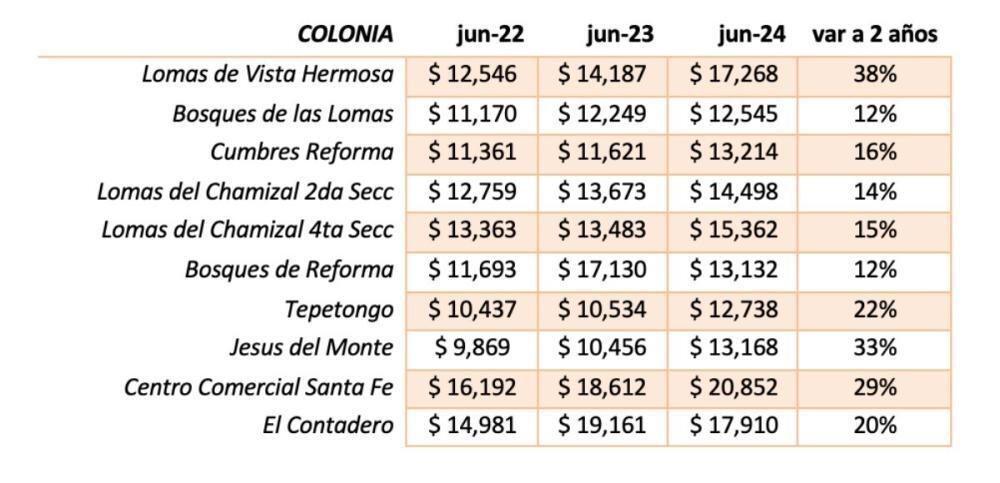 Asimismo, el portal inmobiliario reveló que la renta de un departamento de dos recámaras tiene un precio medio de 18 mil 345 pesos al mes. Y que la colonia Del Bosque es la de mayo precio con 31 mil 567 pesos al mes, mientras que Pantitlán es la más económica con ocho mil 425 pesos por mes.