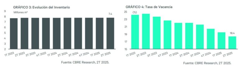 Con respecto al 2T2025, la absorción bruta o espacios comercializados es del 153 mil m2 y alcanzó una cifra acumulada de 283 mil m2, con una participación de tres veces más en renovaciones y ampliaciones comparados con hace un año.